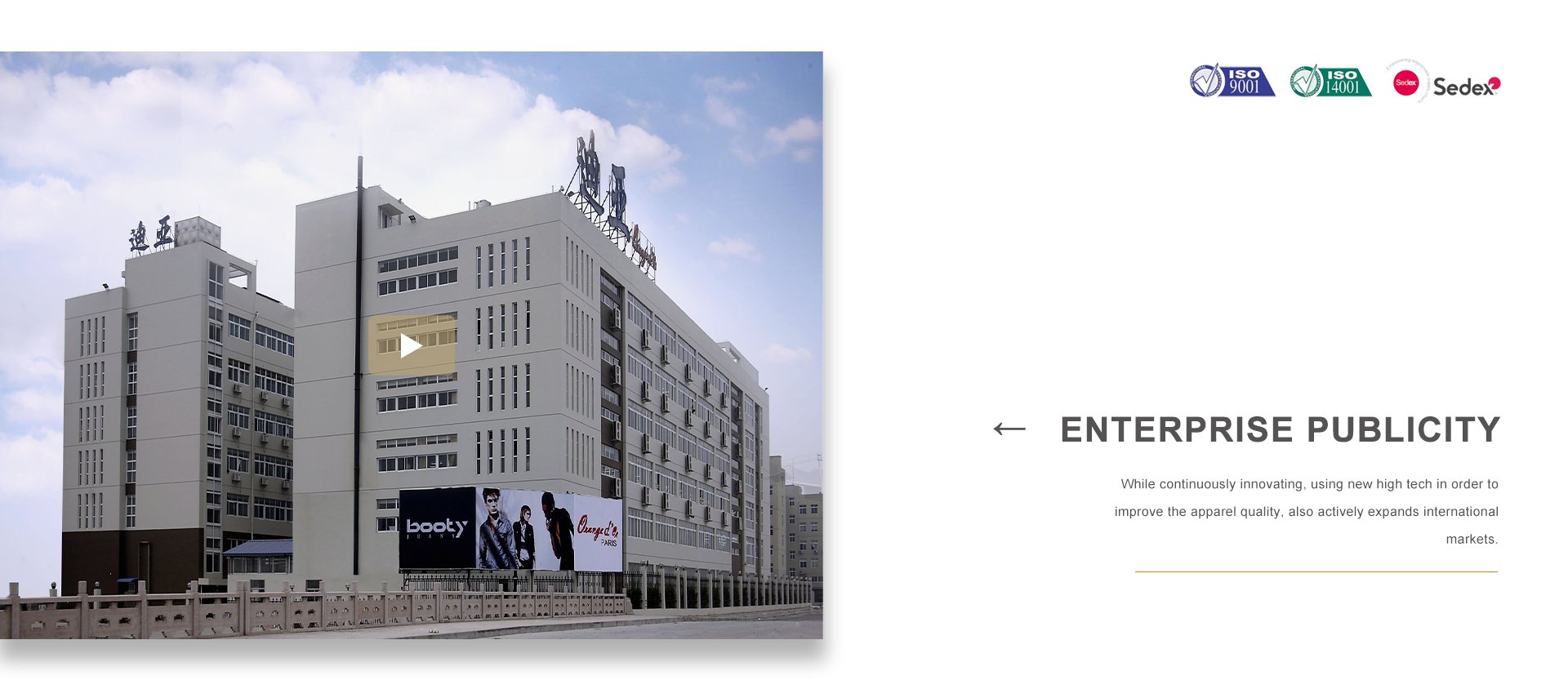 浙江迪亞服飾有限公司于1998年在世界時尚品牌之都——法國巴黎二區(qū)應(yīng)運而生。同年,在浙江省甌海經(jīng)濟(jì)開發(fā)區(qū)東方南路28號設(shè)立服裝制造工廠。公司集服裝設(shè)計、生產(chǎn)、營銷、品牌于一體,在不斷創(chuàng)新、采用高新技術(shù)提高服飾質(zhì)量的同時,積極拓展國際市場,海外營銷部長期與LV集團(tuán)旗下的MAJE、SOEUR、BALIBARIS等國際著名品牌保持非常緊密的合作關(guān)系。品牌建設(shè)是公司堅持不懈的追求,我們每年都會積極參加國內(nèi)外舉辦的各大服裝展銷會。憑借著良好的質(zhì)量與信譽(yù),市場占有率在逐漸擴(kuò)大,產(chǎn)品遠(yuǎn)銷歐洲、美洲、亞洲等國。公司以生產(chǎn)棉衣、羽絨服、派克、大衣、夾克、運動休閑服飾等為主,旗下主打品牌有 ORANGE D’OR 、CLAIRVAL、BOOTY JEANS 、S&V和SASAEC,各品牌服飾均以典雅的色彩、優(yōu)美的線條、卓越的魅力吸引著都市麗人,將時尚、經(jīng)典的潮流信息予以淋漓盡致的演繹。